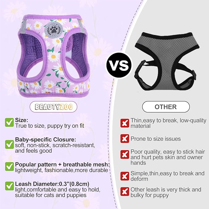 BEAUTYZOO Step in Dog Harness and Leash Set, Floral Pattern Reflective Dog Harness No Pull No Choke Puppy Harness for XXS XS S Dogs Cats, Soft Padded Mesh Vest Harnesses for Girl and Boy Pets