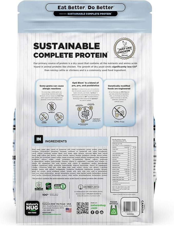 - JUST LIKE CHICKEN RECIPE – Our formula is meat free, but our sustainable complete protein and mix of other ingredientsgives our product a savory flavor that pets love!