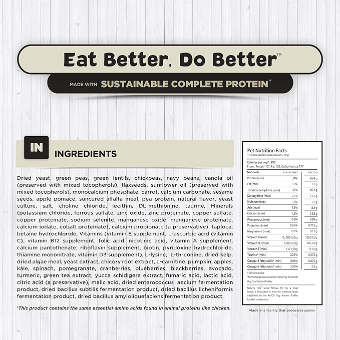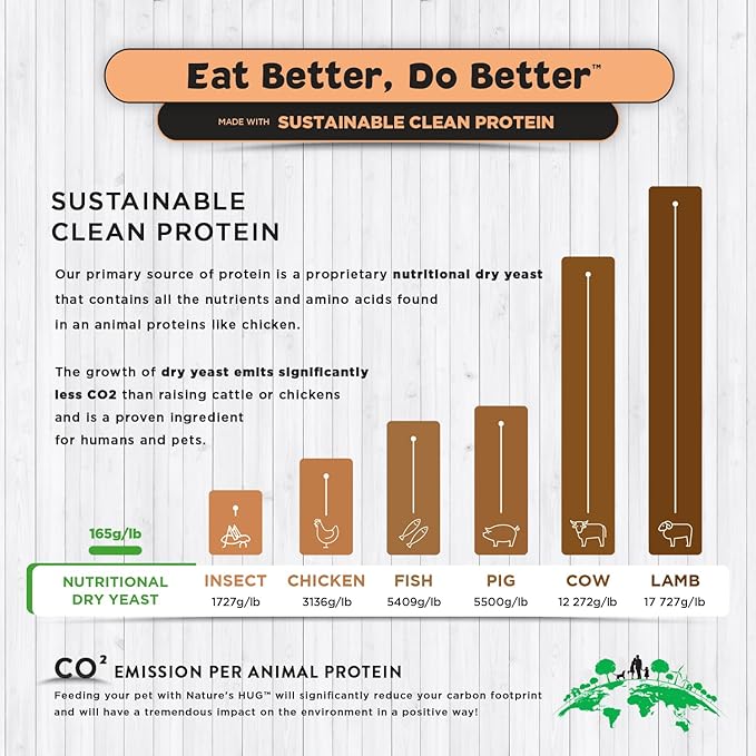 - SUSTAINABLE COMPLETE PROTEIN – Our primary source of protein is a plant-based, dry yeast that provides all essential amino acids and nutrients, similar to animal proteins found in chicken, making it a top choice for vegan dog food and dry dog food options. This eco-friendly protein emits significantly less CO2 than traditional meat sources, supporting a more sustainable, plant-based diet for dogs.