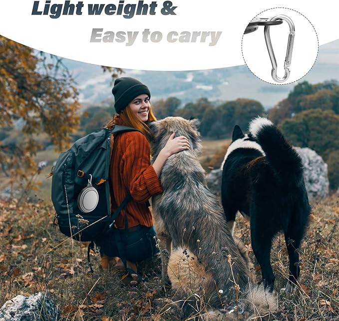 - PORTABLE & CONVENIENT: The collapsible pet feeding and watering bowls are lightweight and easy to carry,can be folded down to a compact size,making them easy to store in bags or cars.Come with 2 carabiners, the compact travel bowls can be attached to belt loop,backpack,dog leash,dog collars,dog carrier,bags,luggage and more.Suitable for outdoor/indoor acitivies,outings and trips.