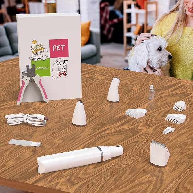 - 【What you get 】 Dog clipper *1, Nail grinder*1,Standard size trimmer *1, Narrow size trimmer *1, Detail trimmer *1, Guide combs *4, Cleaning brush *1, USB cable *1