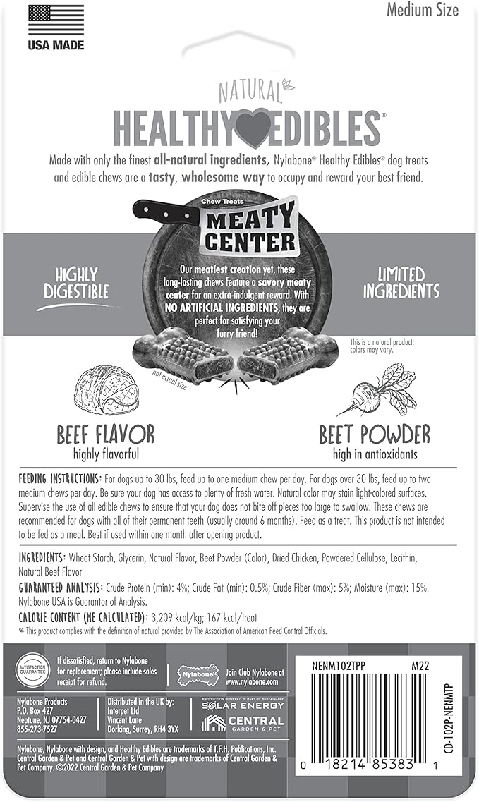 Nylabone Healthy Edibles Natural Dog Chews Long Lasting Meaty Center Beef Flavor Treats for Dogs, Medium (2 Count)