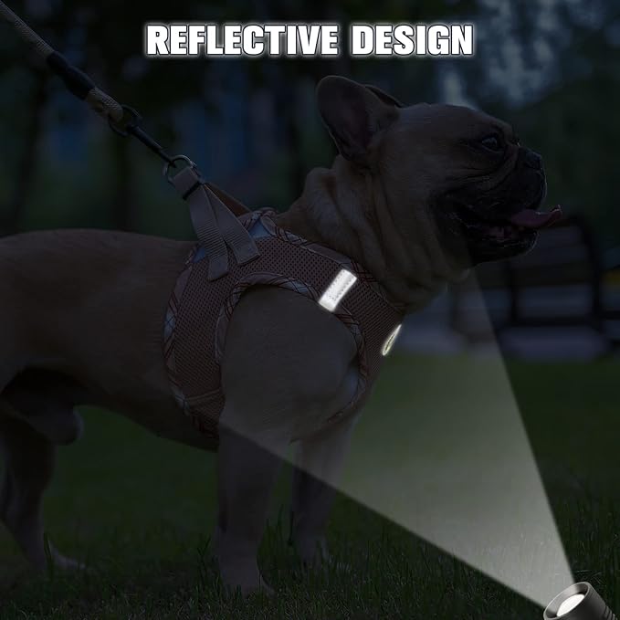 - Professional design: No pull and no choke.The puppy dog harness has a raised design at the front of the chest and is recessed at the bottom edge for a more comfortable fit. With reflective strips on the pet harness and leash, you can take your puppies out at night without worrying about not being able to find them, making them safer in the dark.