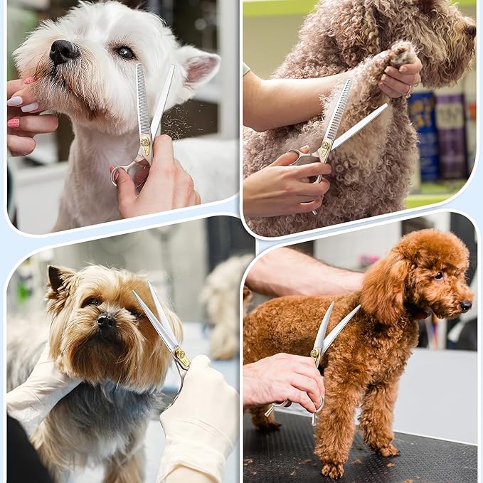 - Sharp Dog Scissors -- With razor-sharp blades and a smooth cutting action, our 7.5" scissors ensure precision haircuts without compromising on safety. These dog groooming scissors set adopt quality steel and precise adjust screw,which makes the dog scissors sharp and solid. You don't need to worry about misalign or cathing your dogs' fur.