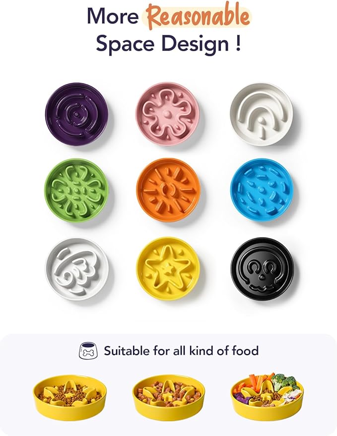 - Slow Down Eating, Bring Dog A Healthy Diet: Fast-eating dogs experience bloat, regurgitation, and obesity easily. Our slow feeder dog bowl design with the ridges and maze pattern helps your dog to eat slower than 18 times. Your dog could change his overeating behavior through a challenge and fun mealtime