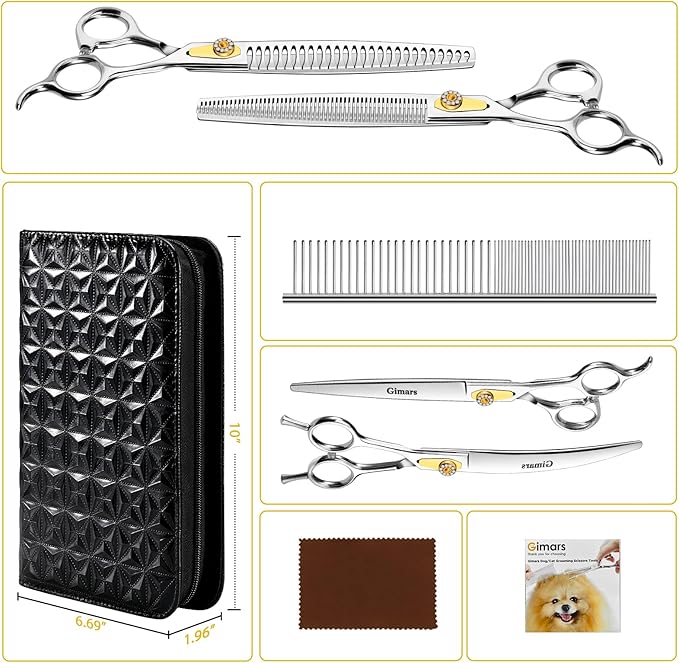 - Complete dog grooming scissors set: This set includes everything you need for a comprehensive grooming session: 8-inch straight scissors, 8-inch thinning scissors, 8-inch curved scissors, 8-inch chunker, a storage case, a cleaning cloth, and a stainless steel comb (comb color may vary). Perfect for all your grooming needs!