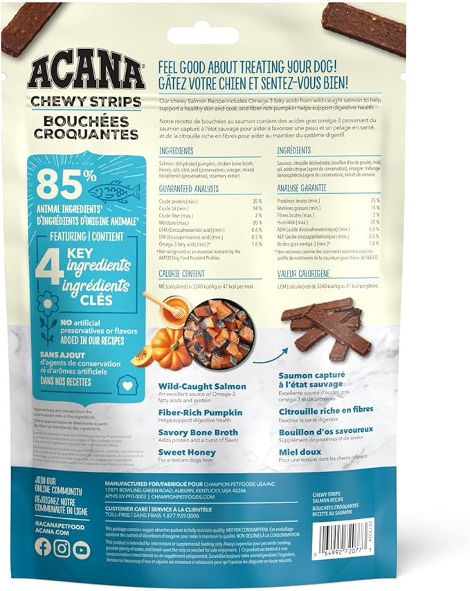- One (1) 4 oz bag of ACANA Chewy Strips Salmon Dog Treats