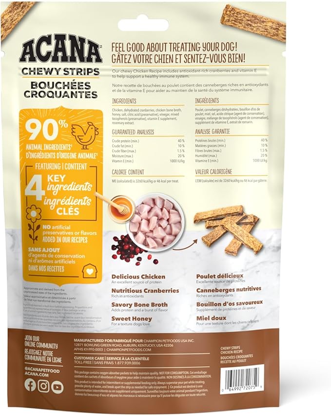 - One (1) 4 oz bag of ACANA Chewy Strips Chicken Dog Treats