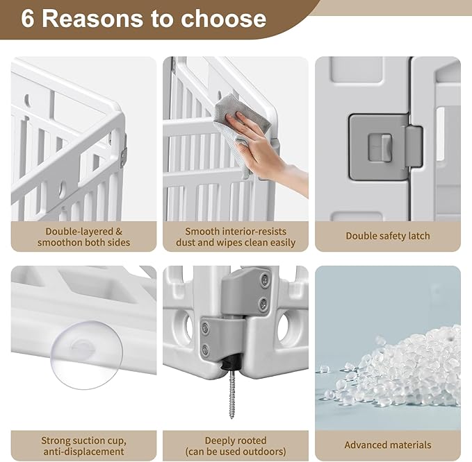 - EASY TO INSTALL: Our dog fence comes with 5 panels and 1 panel with door,pet playpen constructed with simple assembly instructions will set up in minutes. You can quickly place the pet fence where you want.Door panel with latch type door lock to prevent puppy from entering and exiting at will