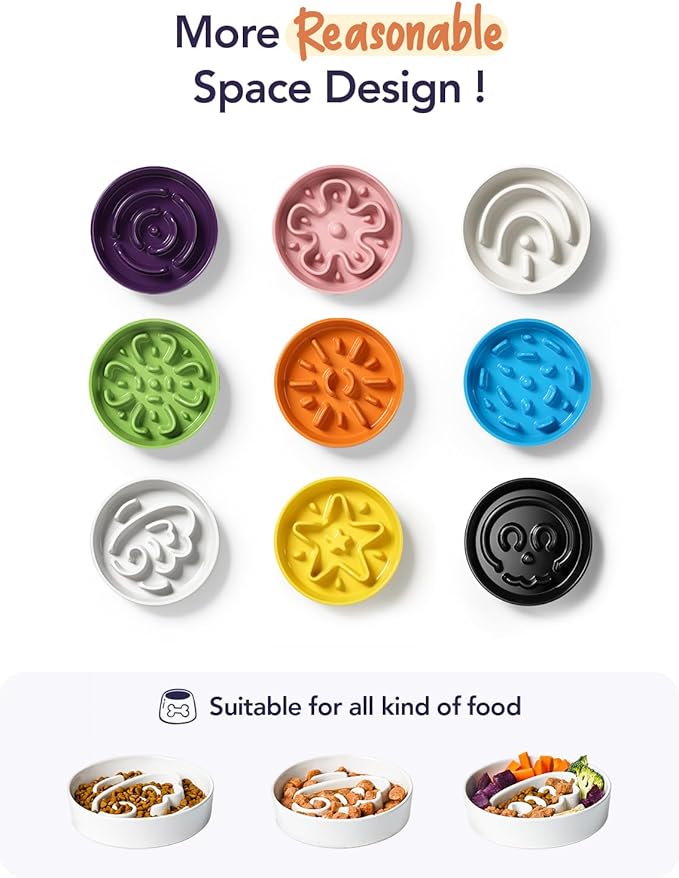 - Slow Down Eating, Bring Dog A Healthy Diet: Fast-eating dogs experience bloat, regurgitation, and obesity easily. Our slow feeder dog bowl design with the ridges and maze pattern helps your dog to eat slower than 18 times. Your dog could change his overeating behavior through a challenge and fun mealtime