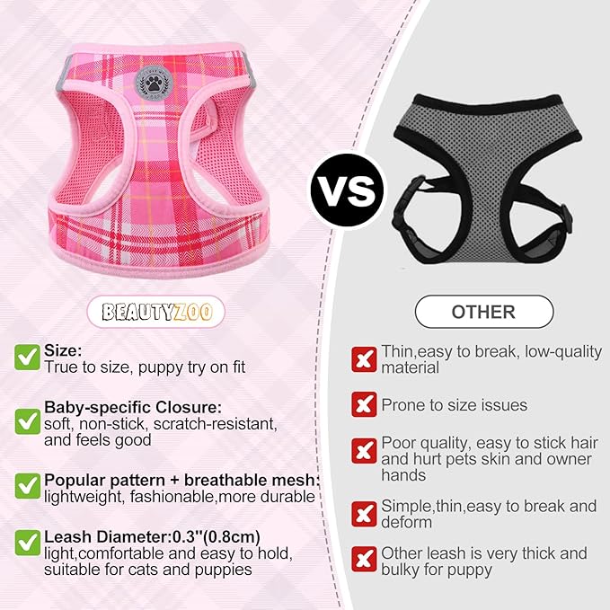 BEAUTYZOO Small Dog Harness and Leash Set, Step in No Chock No Pull Soft Mesh Dog Harnesses Reflective for Small Medium Puppy Dogs and Cats, Plaid Dog Vest Harness for S M Pets, Light Pink S