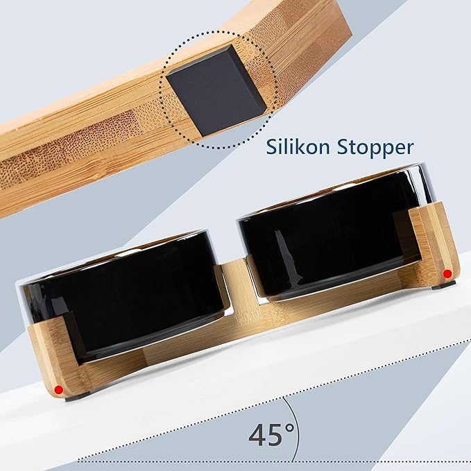 - [Double Bowl Design]:One dog bowl for food and one for water, Each ceramic cat bowl has a Unique wooden stand, raising the dishes closer to your pet for more comfortable eating