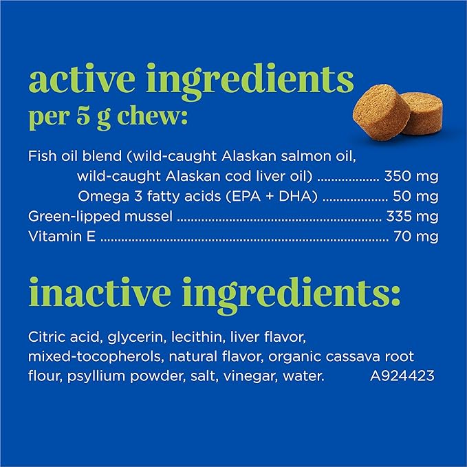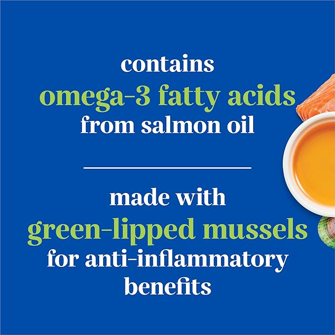 - Dog joint supplement containing omega-3 fatty acids from salmon oil to help ease joint stiffness due to normal daily exercise and activity