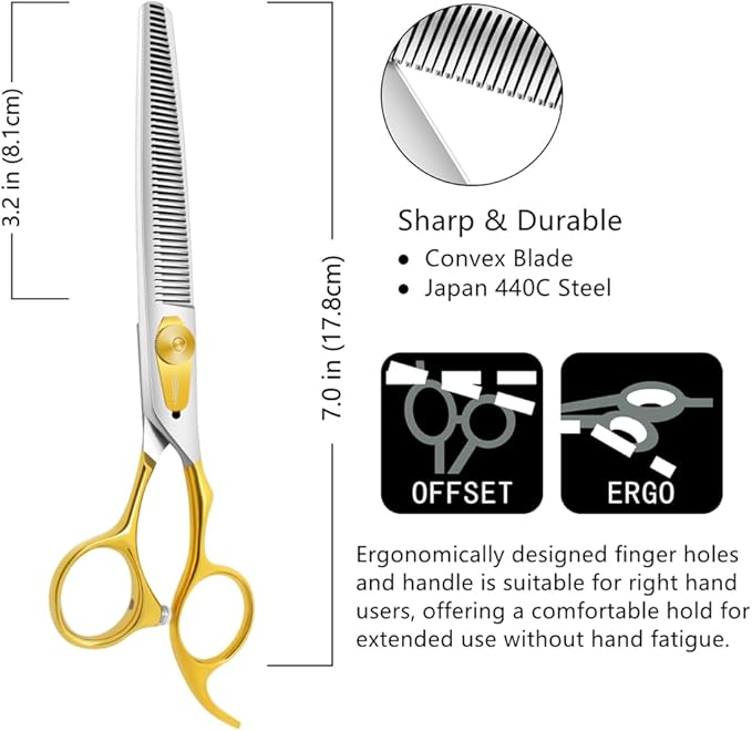 - 【30% Thinning Rate】-- 7.0 inch size with 46 teeth allows for efficient removal of excess hair, thinning rate up to 30%, It keeps your fur baby from looking chopped when cutting hair. This is a good pair of thinners when doing touch ups on clean fur.