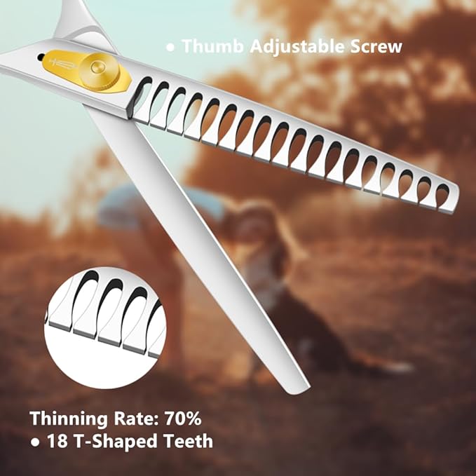 - 【70% Thinning Rate】-- 7.0 inch with 18 teeth allows for efficient removal of excess hair, thinning rate up to 70%, If the dog’s coat has gotten very shaggy and thick,the chunkers will help you cut through his fur easily, making it a breeze to use,so these scissors are perfect for professional groomers or home use.