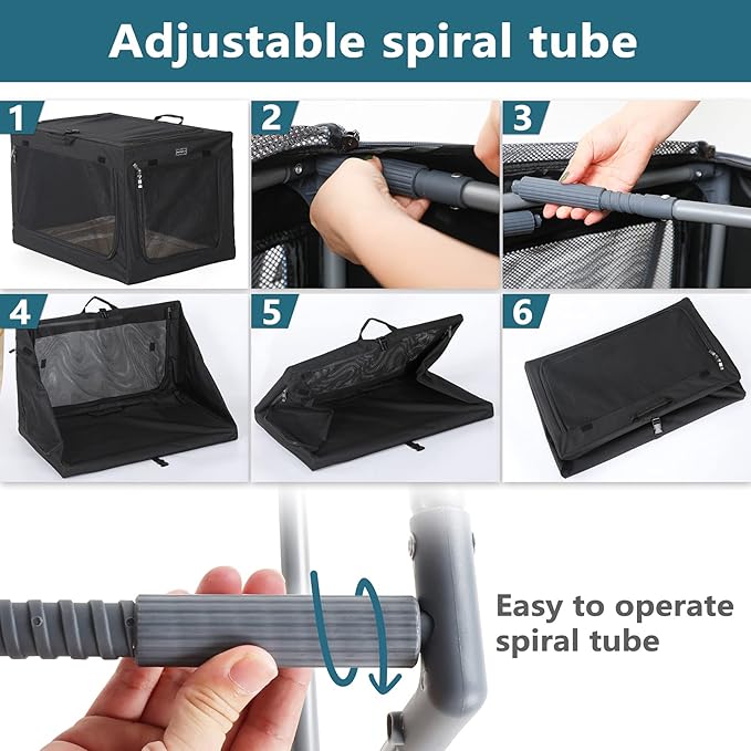- Our innovative full-pipe support system ensures enhanced stability and safety, preventing any collapse even when your dog leans against the pipe with their paws. When needed, simply rotate the spiral tube downward to effortlessly fold the soft dog crate completely flat. Plus, the top handle makes it convenient for on-the-go transport during your outings.