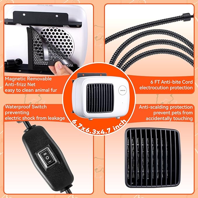 - Easy to Install and Clean: independent safety bracket makes the heater easy to install in the dog house; Only 3 steps: 1. Find a position taller than your pet; 2. Drill hole; 3. Hang the heater; Then you can let your pet enjoy a warm winter; Meanwhile, the magnetic removable hair guard on the back of the heater makes it easy to clean your pet's hair and dust without removing the heater, convenient for daily use