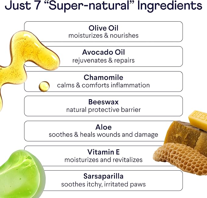 - Only 7 Super-Natural Ingredients - olive oil, avocado oil, chamomile, beeswax, aloe, vitamin E, and sarsaparilla unite to nourish, protect, and repair your pup’s precious paws.