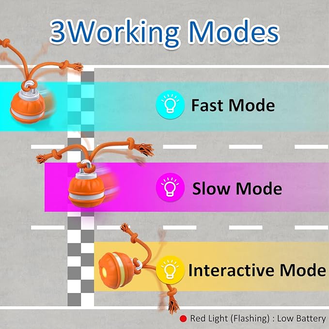 - Three Mode: Fast Mode (blue light), the peppy pet ball for dogs will automatically fast rolling for 5 minutes, then go into standby mode. Slow Mode (purple light), the interactive dog toys balls will slow moving for 5 minutes, then go into standby mode. Interactive Mode (purple light), the active rolling ball for dogs only activate when touch