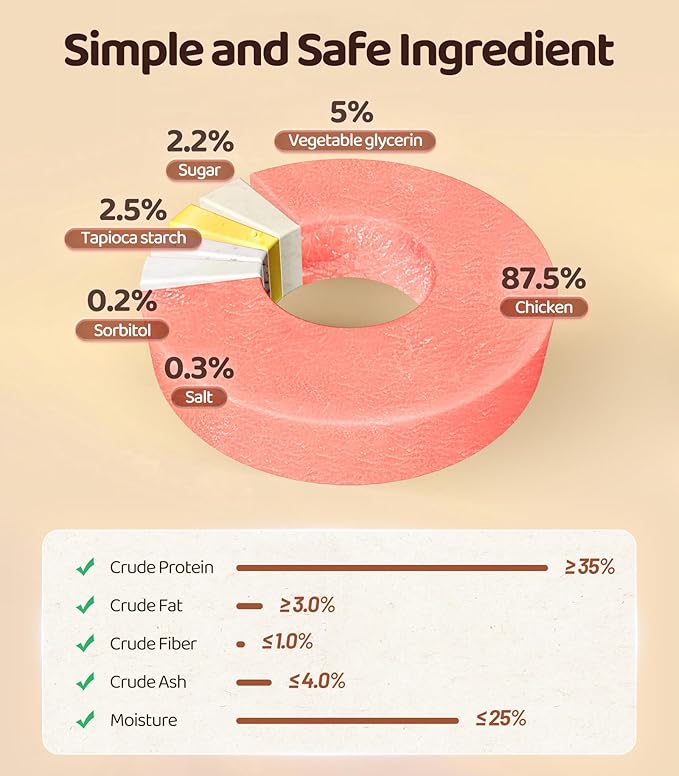 - 【Easy to Digest】The perfect combination of taste and nutrition! Made with premium-quality more than 87.5% chicken, these small pieces are packed with protein, low in fat, and easy to digest, making them an excellent choice for your pet's snacking needs. Our Chicken Sausages are easy to digest, making them gentle on your pet's stomach for worry-free snacking