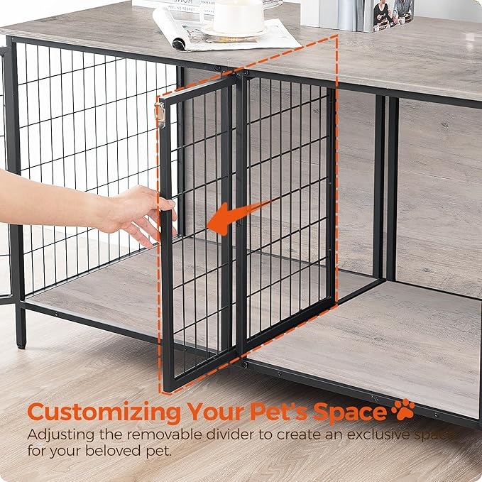 - Right Size: The size of the dog crate is 43.3"L x 21.7"W x 26.4"H, before purchasing, please measure the height and length of your pet to ensure enough comfort. This dog crate furniture has a spacious interior for your furry friend, suitable for 2 small dogs under 40 lb each, or a large dog under 80 lb