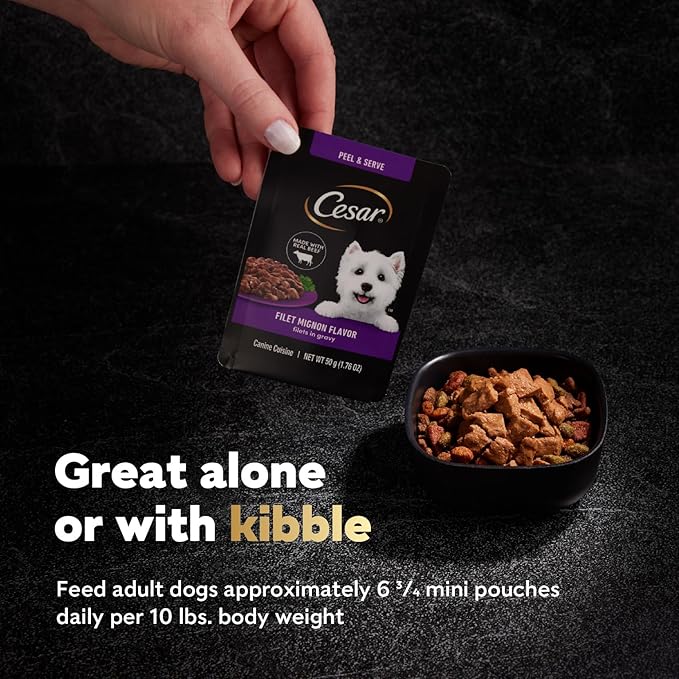 - 40-Count Variety Pack: Variety pack contains fourty (40) 1.76 oz. Mini-Pouches of CESAR Filets in Gravy Wet Dog Food, (20) Filet Mignon Flavor and (20) Rotisserie Chicken Flavor