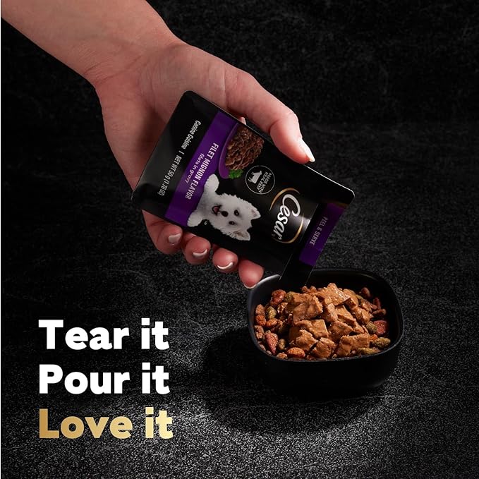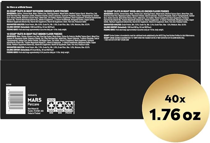 - 40-Count Variety Pack: Variety pack contains forty (40) 1.76 oz. Mini-Pouches of CESAR Filets in Gravy Wet Dog Food Filet Mignon Flavor, Rotisserie Chicken Flavor, and Wood-Grilled Chicken Flavor