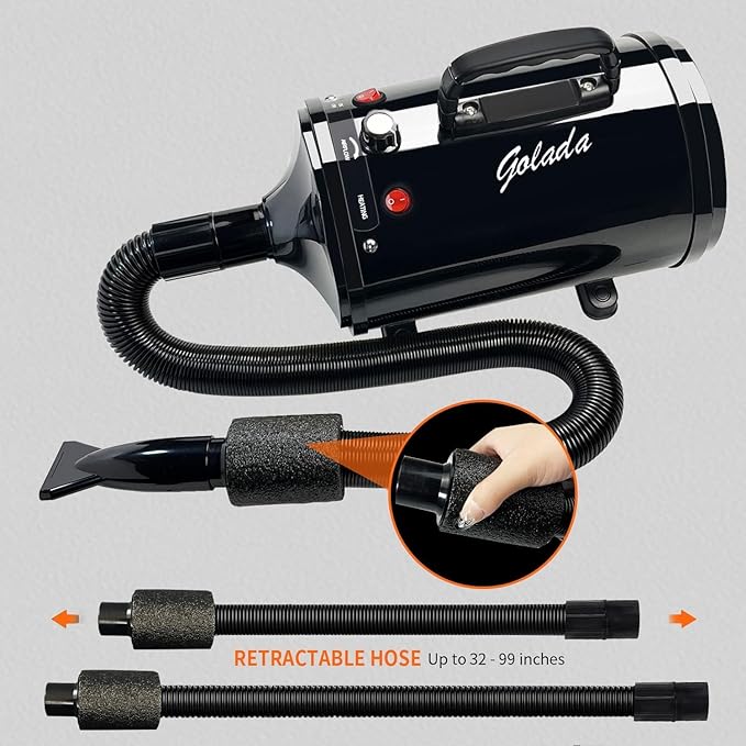 - Easy to Use and Store: Our dog dryer is lightweight and compact, making it easy to handle and store. The ergonomic handle provides a comfortable grip during use, while the flexible hose allows for effortless maneuverability. Keep your grooming area tidy and organized with this convenient and space-saving dryer.