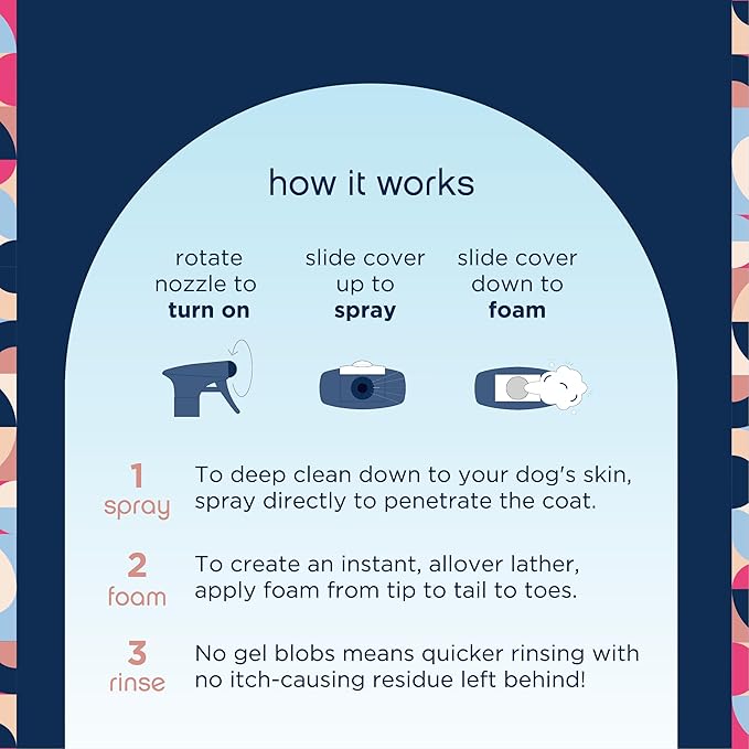- Product Benefits : Two ways to clean and soothe your pup with our anti-itch oatmeal formula: 1. spray to deeply penetrate Use spray nozzle for deep, nourishing clean. 2. foam to lather up Use foam nozzle for an easy, foaming bath. Two ways to clean and soothe your pup with our anti-itch oatmeal formula: 1. spray to deeply penetrate Use spray nozzle for deep, nourishing… See more