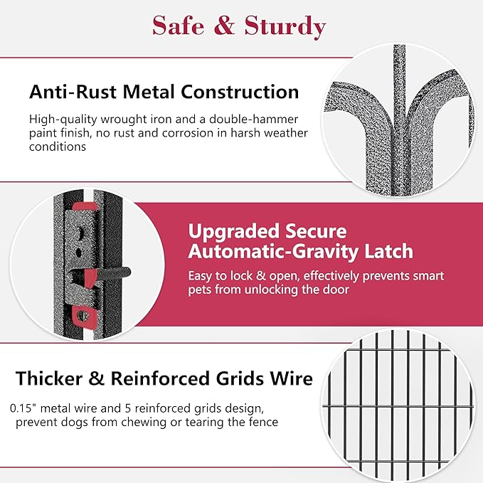 - 【Anti-Rust Coatings Finish】- The dog pen outside is coated with multiple layers of anti-corrosion coating powder and non-toxic wrought iron finish, prevent rust and corrosion, ensures works well in various bad weathers and extend its life, great indoor and outdoor dog play pen for people and dogs