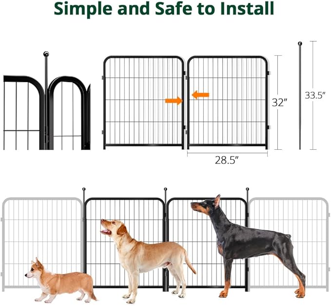 - 【Stable Heavy & Safety】 Heavy-duty thickened iron metal tube design is more stable and anti-collapse, will not collapse and cause injury when the dog is leaning on the fence; the metal surface is treated to have no rough, sharp spots that could harm your pet; The metal stakes feature a rounded ball head to ensure your dog doesn't hurt them if they jump off the edge of the fence, unlike the barb designs on the market.