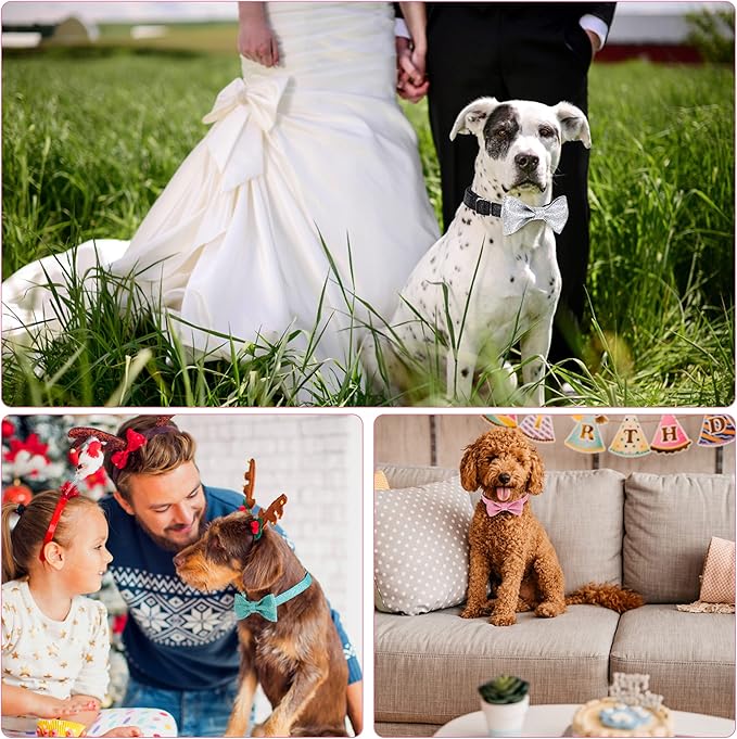 - HIGH QUALITY CONSTRUCTION -- Our bowtie dog collar with quick release metal buckle,much easy to put on and take off,thick welded D-ring provides safe attachment point for leash. Each bow is attached to collar by using two elastic straps and all handmade. The elastic positioned each side of the bow prevents it from moving around on the collar