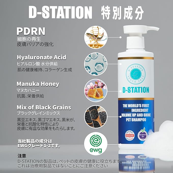 - D-STATION PDRN pet shampoo was developed through two years of research without animal testing based on verified papers, and passed the German DermaTest and the Korean Hypoallergenic Test (GSC Global Certification)