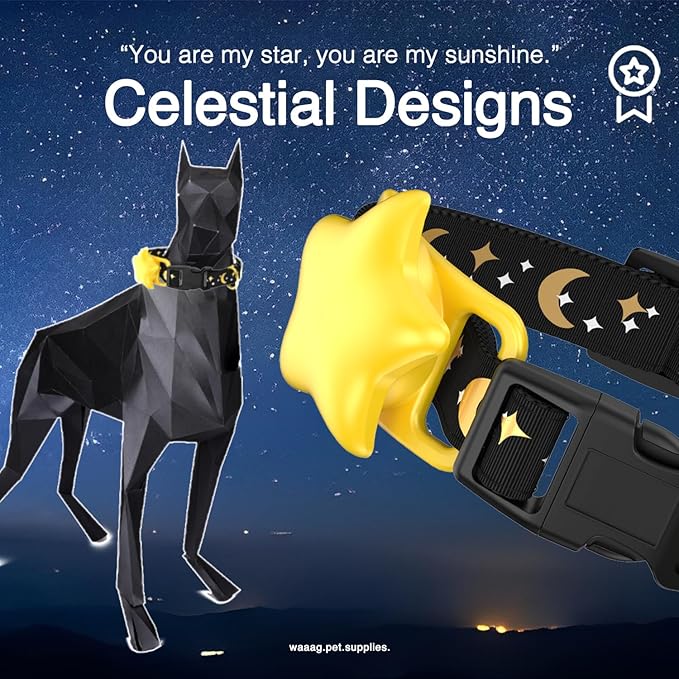 - 【Stylish & Eye-catching Design】Featuring an exclusive moon and star design collar and adorable sun-shaped AirTag holder, your dog will not only be safe but also make a fashion statement. Prepare for an influx of compliments on your dog's stylish appearance.