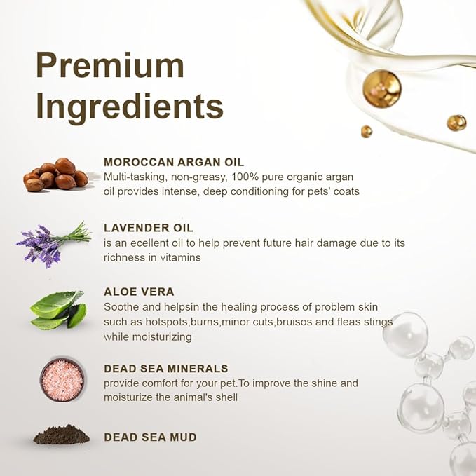- [Dead Sea Mud): Enriched with Dead Sea mud known for its natural cleansing properties, this dog shampoo effectively removes dirt and impurities from your pet's coat.