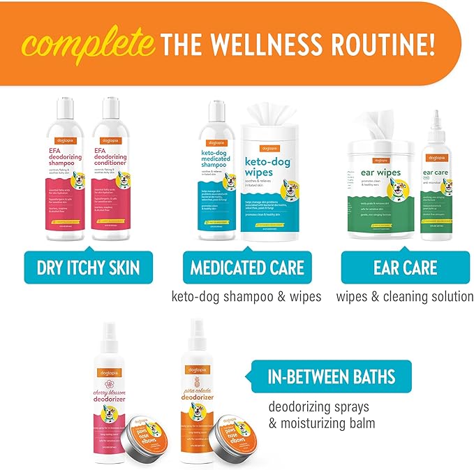 - With their gentle formulations and incredible cherry blossom scent, Dogtopia’s EFA Deodorizing Shampoo and Conditioner are safe for everyday use and will keep your pet clean, comfortable, and smelling fresh.