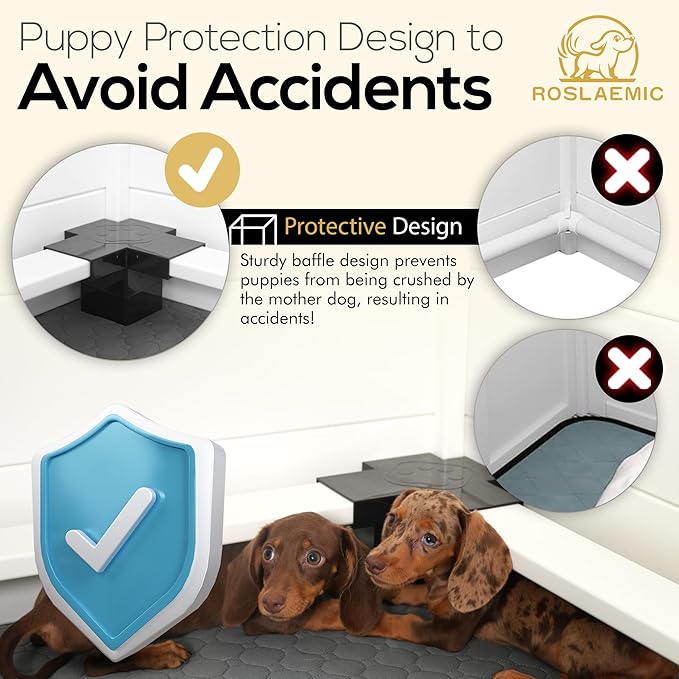 - Sturdy and Clean - Roslaemic welping box is made of Pet-friendly plastic. The 19-inch-tall dog whelping pen has internal dimensions of 48 x 48 inches. Installation takes only five minutes and no tools are required.