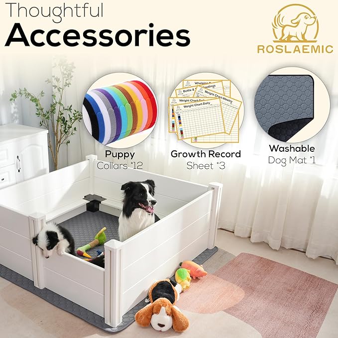 - Includes Puppy Whelping Supplies - Package additionally includes 50*50in washable puppy mat *1, puppy collars *12 and growth charts *3.