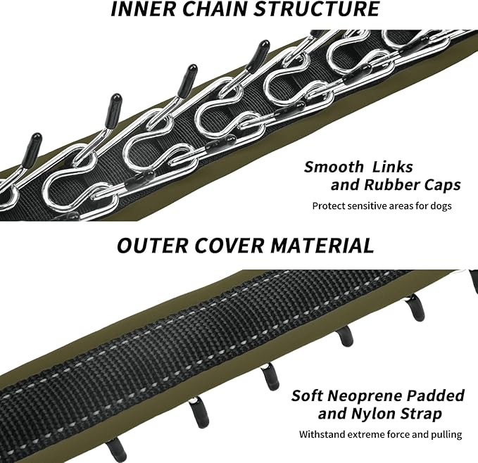 - đŸăStrong & Durable MaterialăThe inner chain of No Pull Dog Collar is made of stainless steel links, rust-proof and waterproof. Outer cover design with Full Surround Soft Neoprene Padded and Nylon Strap, which can withstand extreme force and pulling power. Combination of two layers adds extra safety to prevent Anti Pull Dog Collar from falling apart, more sturdy and durable.