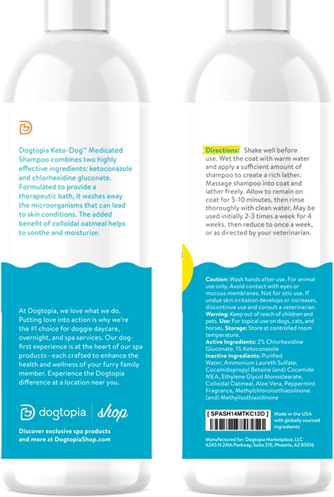 - Formulated to provide a therapeutic bath with a hint of mint scent, Dogtopia’s Keto-Dog Shampoo washes away the dirt and irritants that can lead to skin conditions. The added benefit of colloidal oatmeal helps to soothe and moisturize.