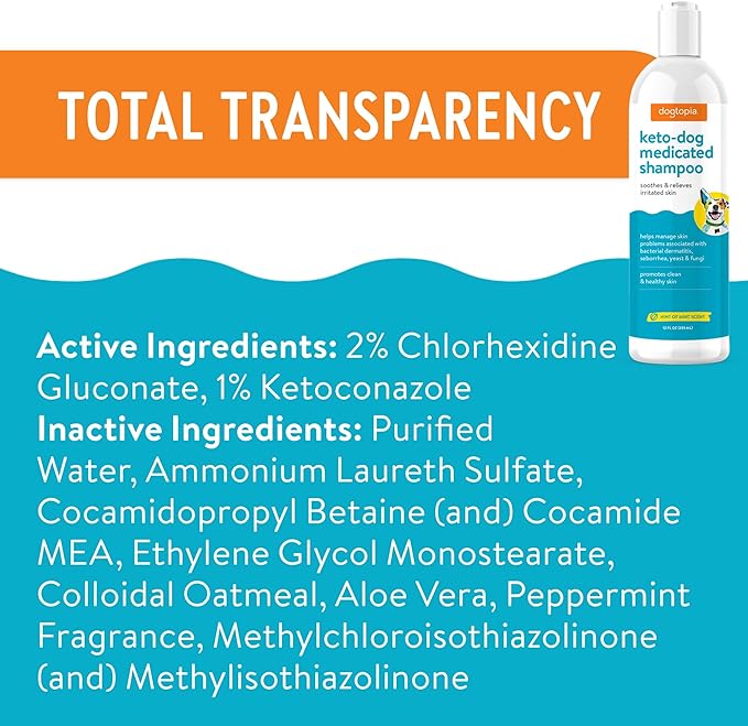 - Made with highly effective ketoconazole and chlorhexidine gluconate, Dogtopia’s Keto-Dog Shampoo and Keto-Dog Wipes soothe and relieve irritated skin.