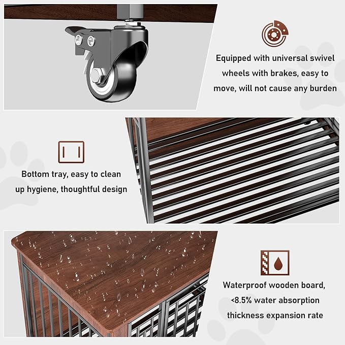 - SPECIAL DESIGN AND STYLE of DOG KENNELS : Because of the wheels, you can move this puppy crate anywhere, indoors or outdoors. And there is a buckle design on the wheels, you can lock them to keep the dog crates for dogs fixed. There is a tray at the bottom of the dog house with door to collect the dog's excrement and avoid dirtying the house. You also can put pet supplies on the top of the dog crate furniture for small dogs.