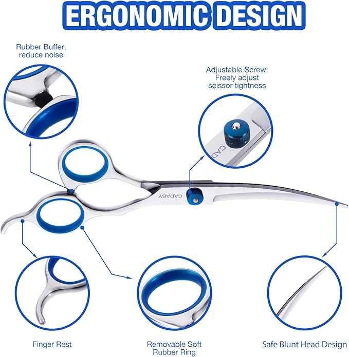 - Ergonomic Design: CADABY dog scissors for grooming are comfortable to hold by right hand. A rubber bumper at the handle which can reduce noise during trimming and keep your pet won't frightened. Our dog scissors equipped a adjust screw,you can adjust the tightness of the scissors according to your personal feeling. Very convenient