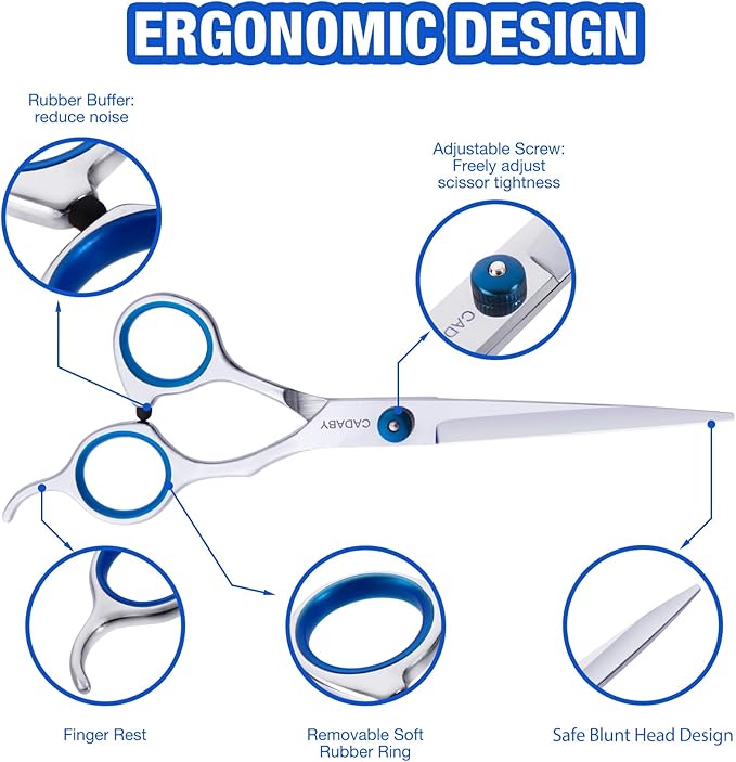 - Ergonomic Design: CADABY dog scissors for grooming are comfortable to hold by right hand. A rubber bumper at the handle which can reduce noise during trimming and keep your pet won't frightened. Our dog scissors equipped a adjust screw,you can adjust the tightness of the scissors according to your personal feeling. Very convenient