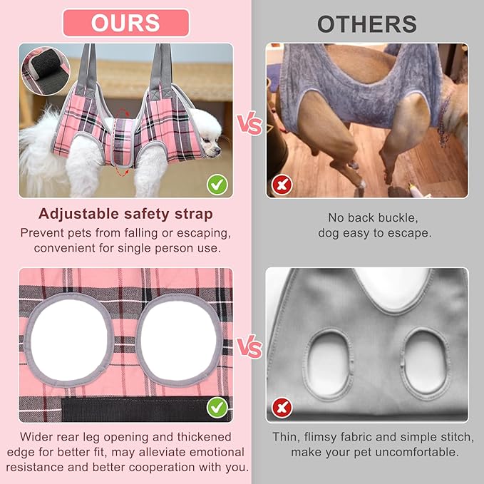 - Comfortable and Safe Hanging Dog Harness for Nail Trimming- 3D air mesh with thickened edges makes this pet grooming sling increase breathability and sturdiness. In addition, dog/cat restraint grooming bag has an Upgraded wider under body support & larger frontal chest/neck space, plus more spacious hind leg openings to keep back legs from pinching. Our Heavy-duty carabiners with better weight bearing, and are more durable secure than other S-hooks.