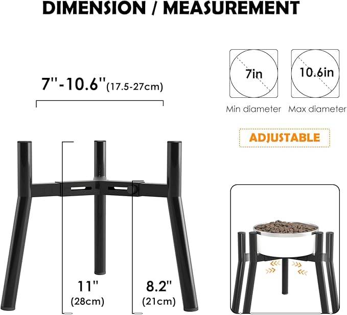 - 【Adjustable-Lockable Width 7"-10.6" Wide】- Simply place the bowl on the rails of the elevated dog bowls and adjust the width of the holder to the size of the bowl. Once you have determined the proper inside diameter, tighten the bolt to lock the width. Easy to tighten and loosen without tools.