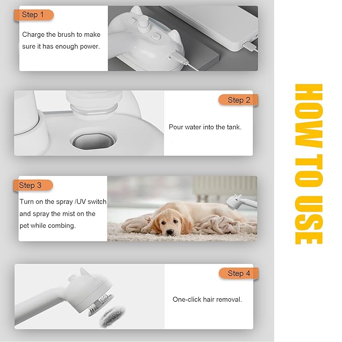 - 4 in 1 Cat Steamy Brush: Our cat steam brush combines hair removal, steam spray, self-cleaning and blue lighting features, which help you more easy to shed the hairs for pets. Compare to traditional pets brush, this steamy brush can effectively clean plucked hair, making it convenient, simple to use