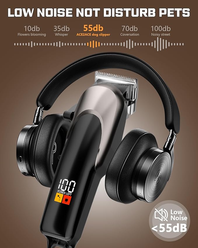 - Low Noise, Similar to normal indoor conversation: The running sound of our Professinal dog grooming clliper is lower than 55db, which similar to normal indoor conversation that don't scared your dog or cat to ensure continuous grooming