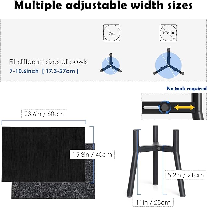 - 【Adjustable-Lockable Width 7"-10.6" Wide】- Simply place the bowl on the rails of the elevated dog bowls and adjust the width of the holder to the size of the bowl. Once you have determined the proper inside diameter, tighten the bolt to lock the width. Easy to tighten and loosen without tools.