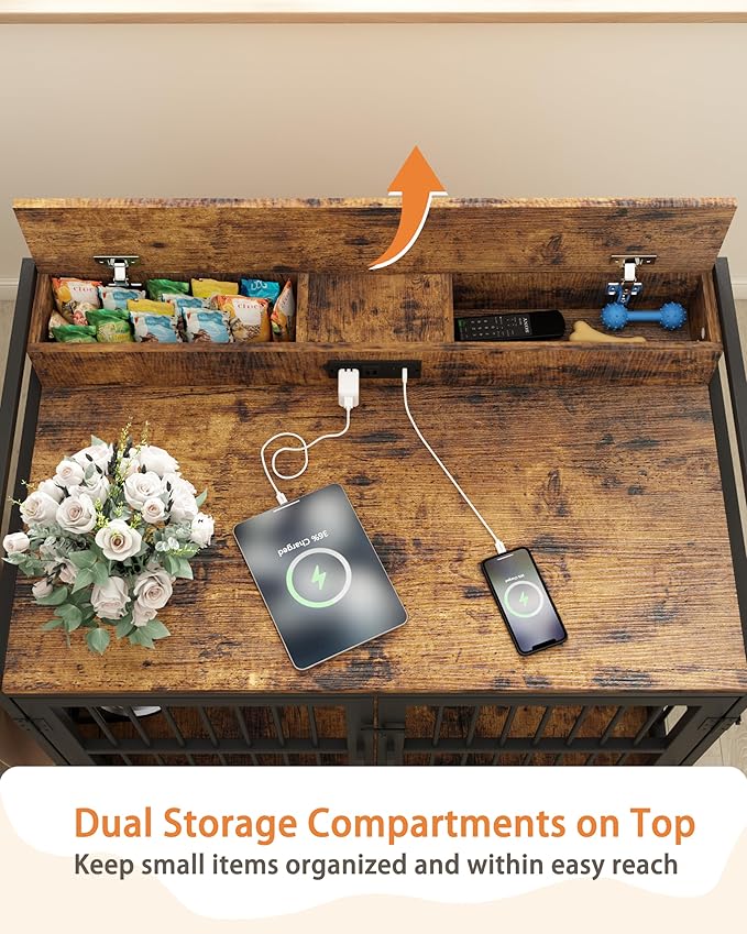 Piskyet Large Dog Crate Furniture,Heavy Duty Dog Crate Table with Charge Station and Storage&360°Rotatable Feeder and Stainless Steel Bowls,Indoor Double Door Kennel with Wheels,Rustic Brown 39.9" L